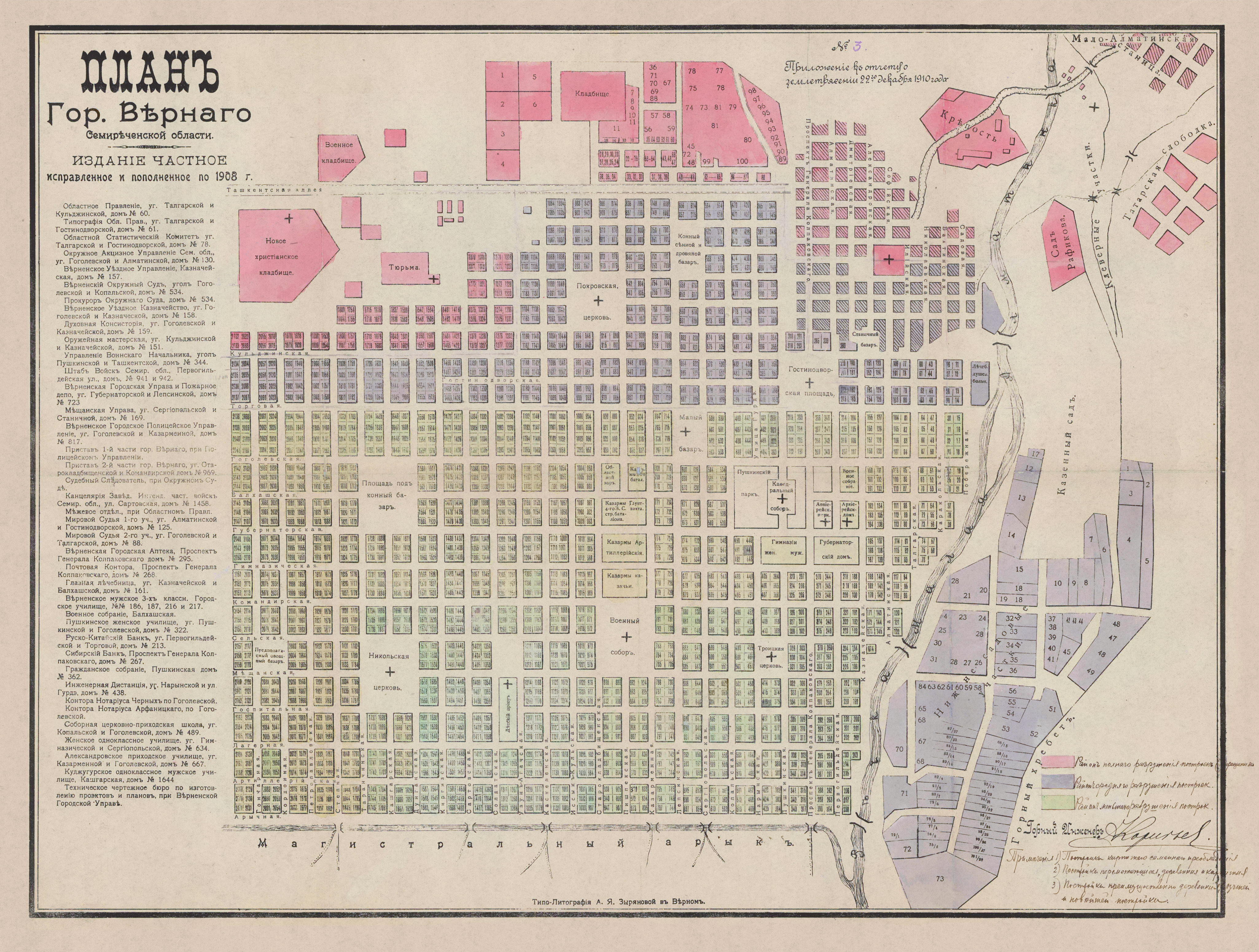 Карта Алматы 1908 года с указанием пострадавших от землетрясения 1910 года районов