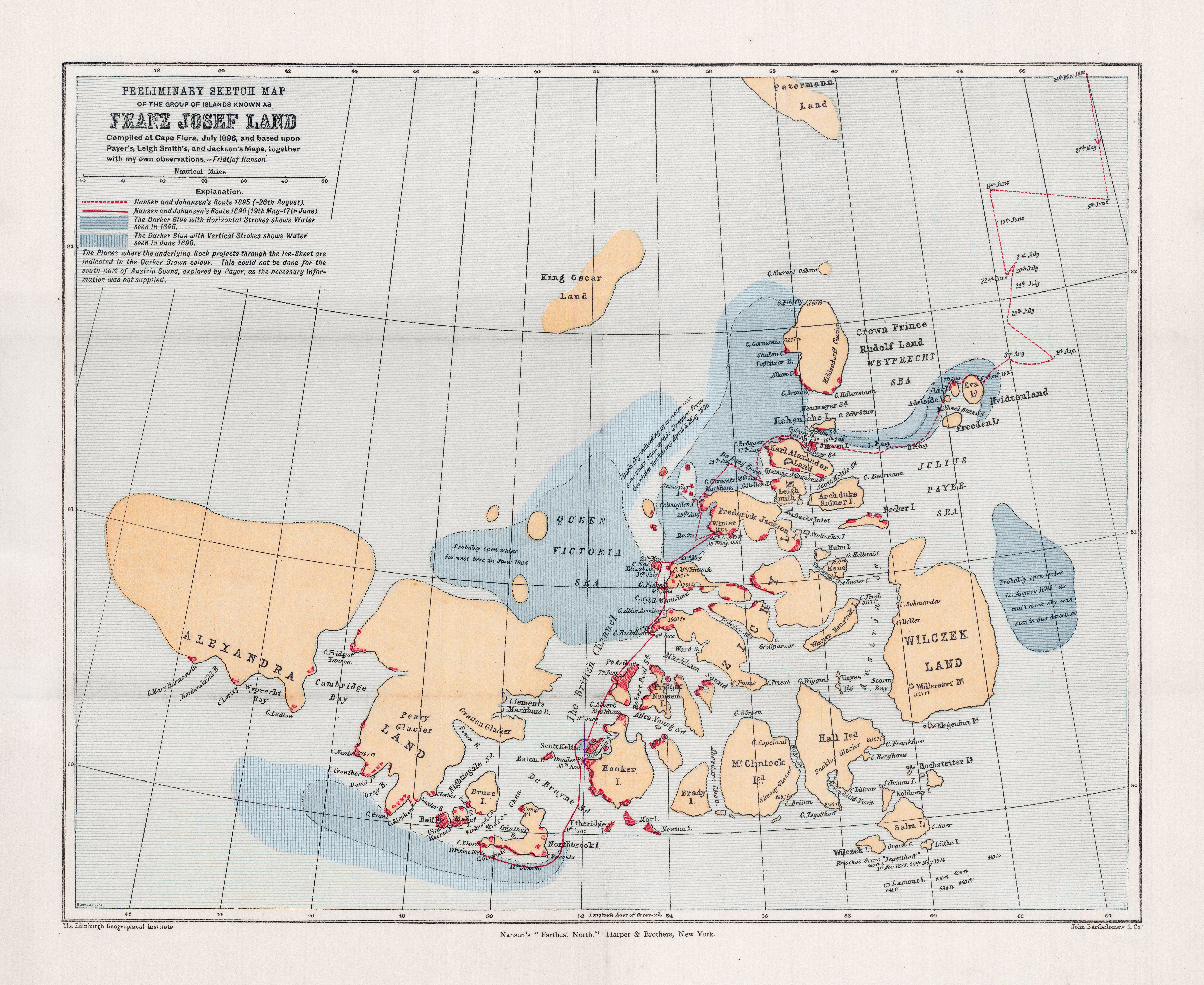 Карта Земли Франца-Иосифа 1896 года с маршрутами Нансена
