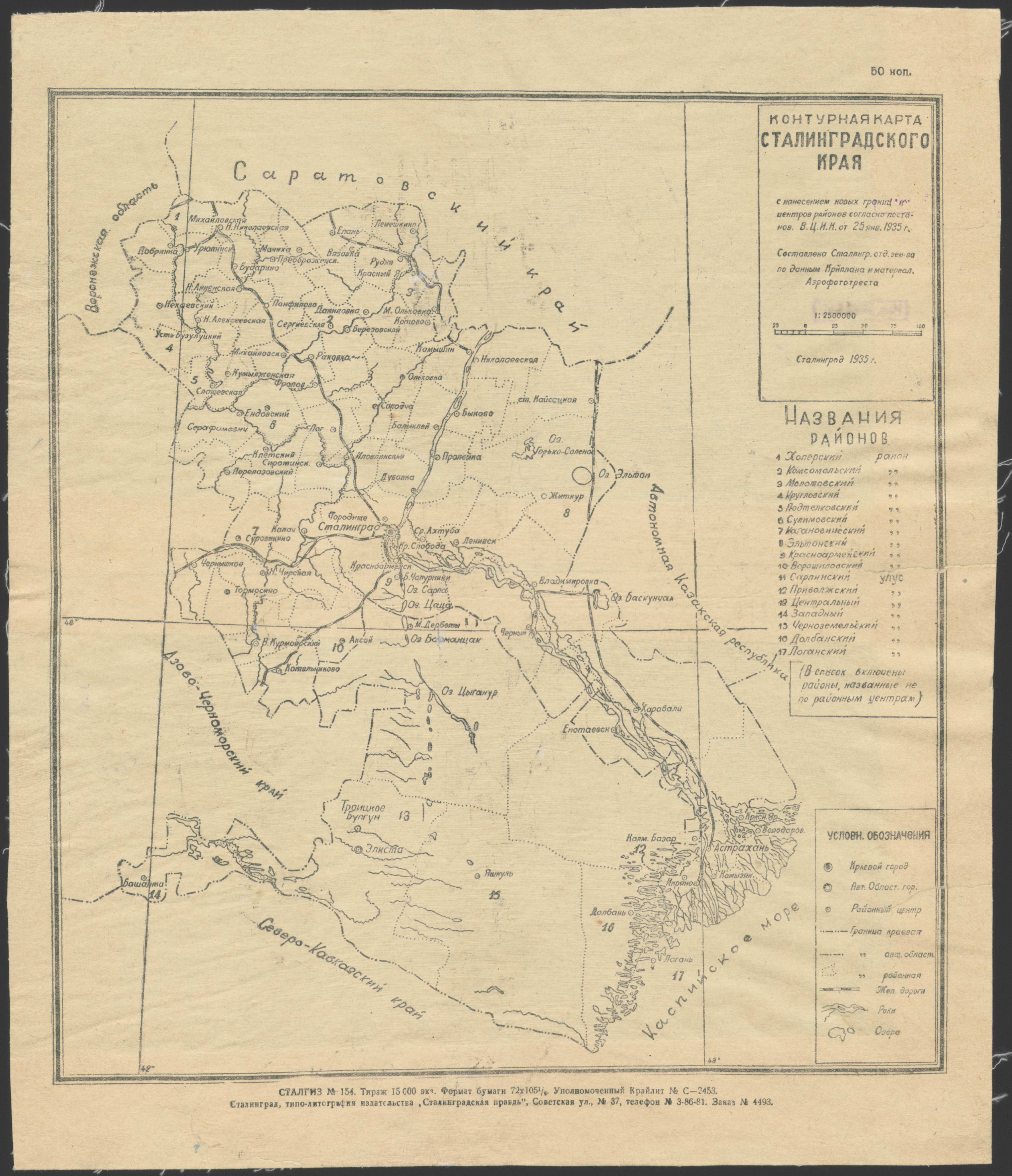 Контурная карта Сталинградского края 1935 года с нанесением границ и центров районов
