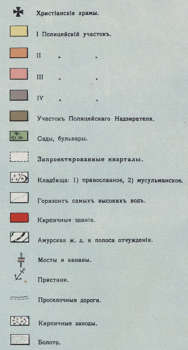 В кварталах крупные черные цифры означают номера кварталов, мелкие черные цифры означают номера квартальных участков, мелкие красные цифры означают порядковую уличную нумерацию. На карте показаны: полицейские участки, христианские храмы, сады, бульвары, проектные кварталы, погосты, уровень разлива Амура, кирпичные здания, ж.д., мосты и канавы, пристани, просёлочные дороги, кирпичные заводы и болота.
