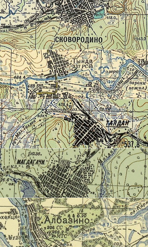 На этой топографической карте времен Великой Отечественной Войны можно посмотреть местность вокруг таких городов и населённых пунктов, как: Сковородино, Тында, Магдагачи, Гудачи, Солнечный, Муртыгит, Аносовский, Беленький, Кувыкта, Маревый, Могот, Толбузино, Албазино, Джалинда, Имачи, Мадалан и т.д. Общий вид карты и вошедшие в неё листы