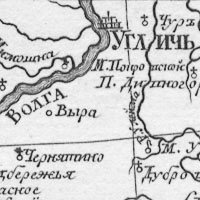 Генеральный план на части реки Волги от града Твери вниз по течению до града и Казани и пригорода Тетюши и до Астрахани с показанием берега, городов, крепостей, форпостов, станиц, сёл и деревень по описи 1766 года. Глубины указаны в футах. Масштаб 5 верст в дюйме.
