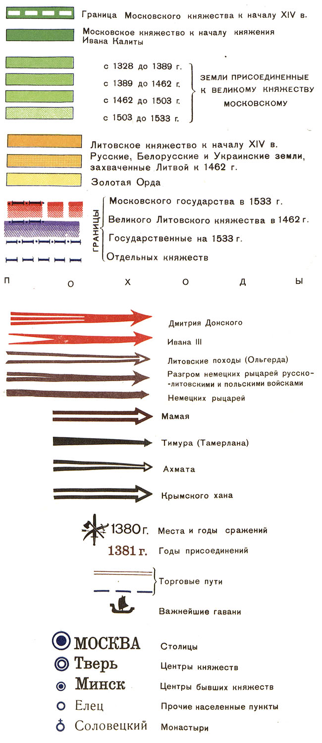 На карте показана граница Московского княжества к началу XIV века, территория Московского княжества к началу княжения Ивана Калиты, земли присоединённые к великому княжеству Московскому с 1328 по 1533 годы, территория Литовского княжества и Золотой Орды, граница Московского государства в 1533 году.