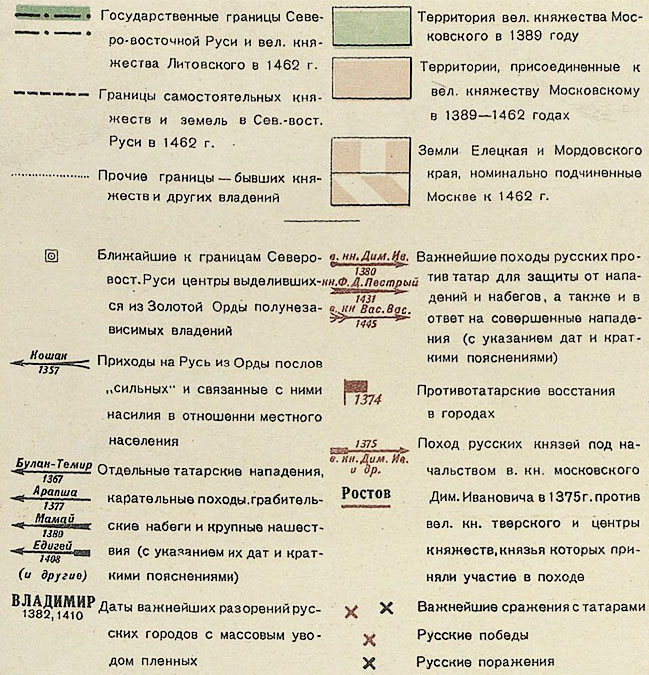 На карте показана территория великого княжества Московского в 1389 году и территории, присоединенные до 1462 года. Обозначены границы самостоятельных княжеств и государственные границы. Схематично показаны пути татарских нападений и походов русских против татар, места восстаний и важнейших сражений. На врезке показана схема Куликовской битвы.