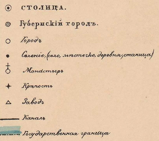 Карта из учебного атласа по Русской истории, составленного и изданного под редакцией Е. Замысловского в 1869 году. Условные обозначения