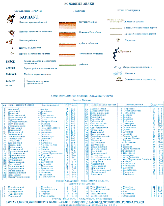 Алтайский край. Главное управление геодезии и картографии МВД СССР, Москва. Масштаб: в 1 см. 10 км. Административные границы даны на 1.10.55. Карта составлена Новосибирской картографической фабрикой в 1950 году и исправлена в 1955. Редакторы: Скурыгина П.В., Ничипиенко Л.И. Формат бумаги: 97x84. Тираж 61000 экз. Цена 2 руб. 30 коп. Переиздание ЦРУ США 1960 год.