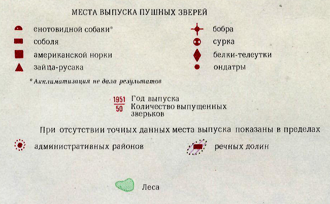 Карта из атласа Алтайского края 1978 года - том I, включающая территории Алтайского края и Республики Алтай.На карте показана акклиматизация пушных зверей по регионам Алтая. Условные обозначения