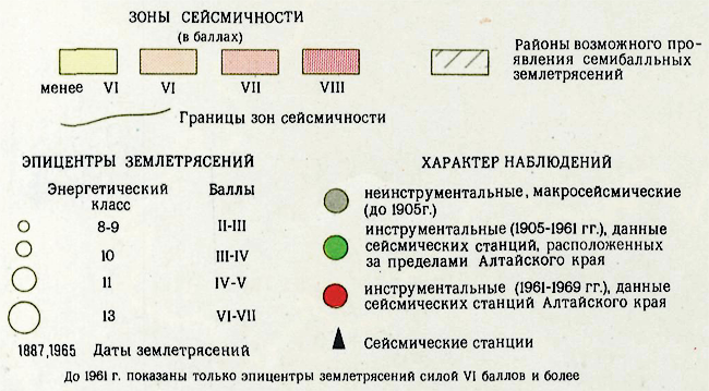Карта из атласа Алтайского края 1978 года - том I, включающая территории Алтайского края и Республики Алтай.На карте показаны зоны сейсмичности, центры землетрясений, районы возможного проявления семибалльных землетрясений на Алтае. Условные обозначения