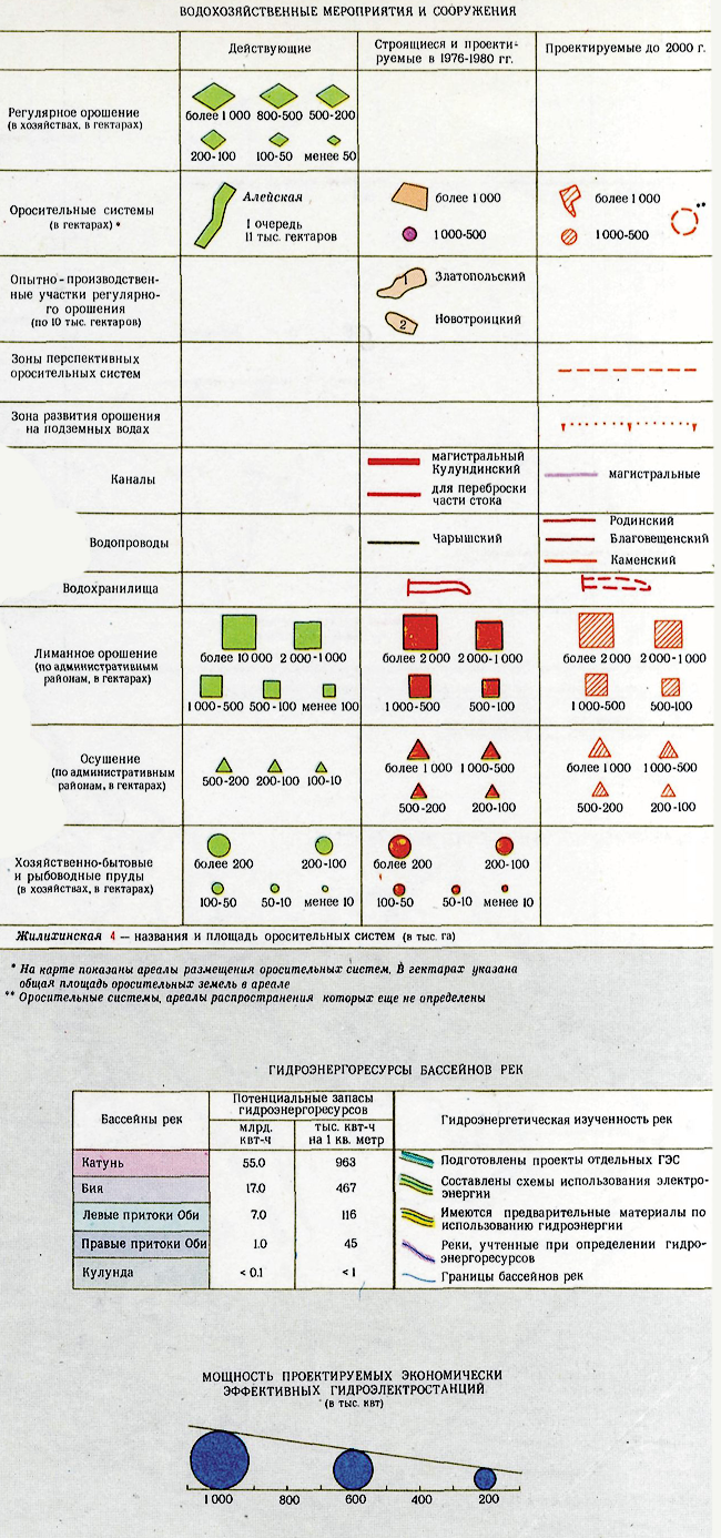 Карта из атласа Алтайского края 1978 года - том I, включающая территории Алтайского края и Республики Алтай.На карте показаны водохозяйственные мероприятия и сооружения, а также гидроэнергоресурсы бассейны рек. Условные обозначения
