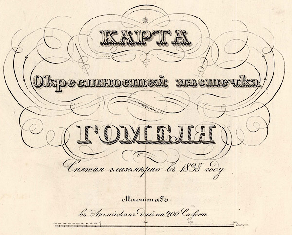 Карта окрестностей местечка Гомеля снятая глазомерно в 1838 году. Отпечатана на 9 листах размером 50x43 см. Масштаб 200 саженей в дюйме.