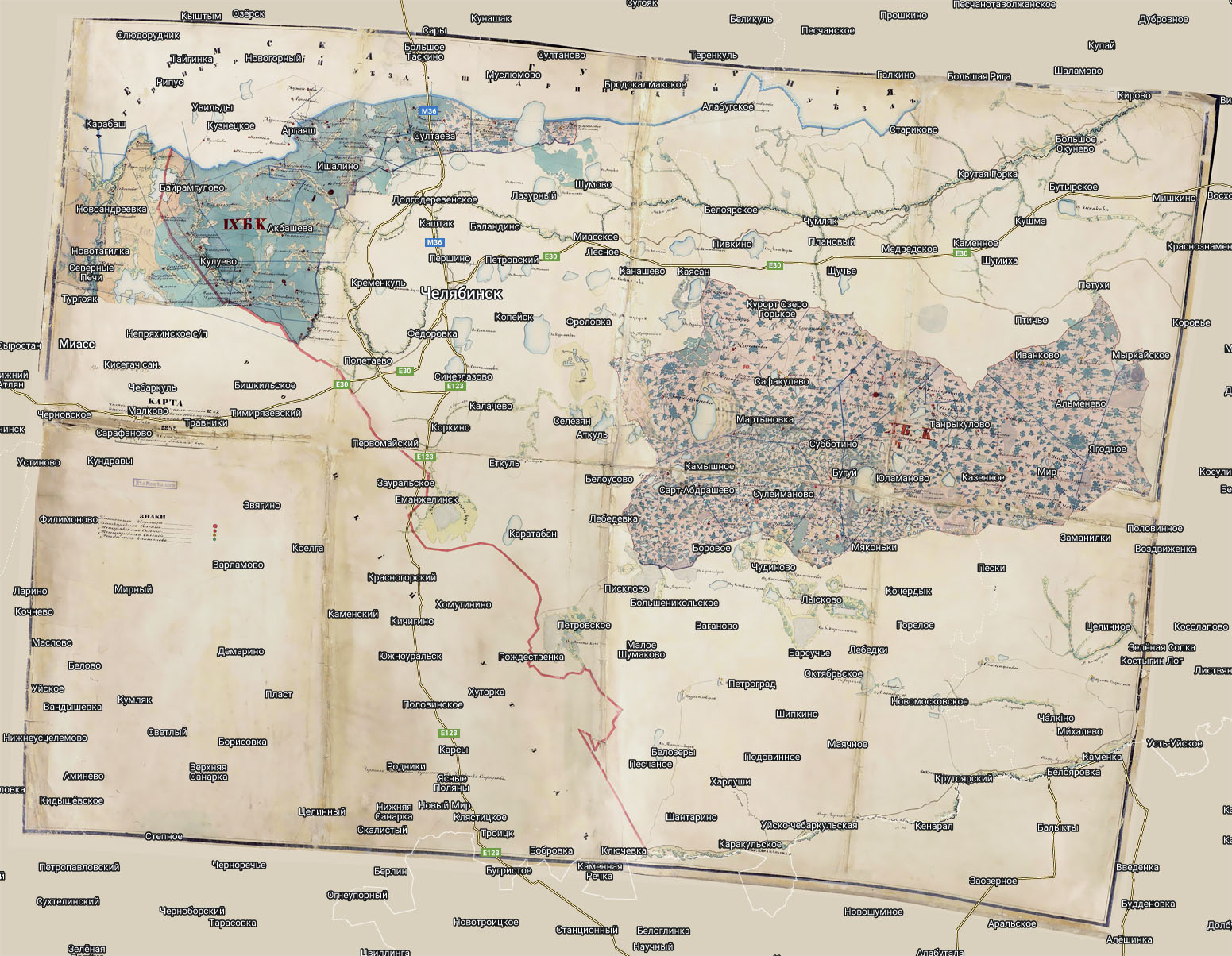 Рукописная карта Челябинского уезда и расположения 9-го и 10-го Башкирских кантонов по новому разделению войска, составленная в чертежной Башкирского войска. Чертил войсковой чертежник чертежной урядник Сафаров. Масштаб в английском дюйме 5 верст.