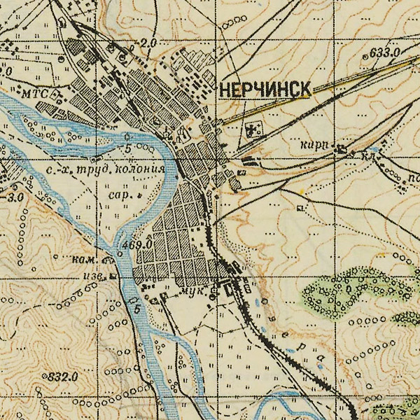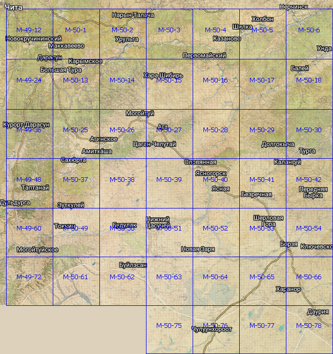 На этой топографической карте времен Великой Отечественной Войны можно посмотреть местность вокруг таких городов и населённых пунктов, как: Нерчинск, Чита, Холбон, Шилка, Первомайский, Карымское, Дарасун, Могойтуй, Агинское, Балей, Будулак, Оловянная, Ясногорск, Шерловая Гора, Борзя, Даурия и многих других. В сборке листы M-50-1, M-50-2 и M-50-37 представлены только масштаба в 1 см. 3 км. Другие части карты