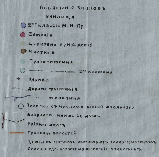 Показаны волостные границы, волостные и простые сёла. Физическая копия хранится в РГИА - фонд 733, опись 187, дело 625. Условные обозначения