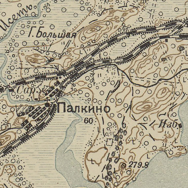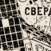 Карта, состоящая из 4-х листов квадрата O-41-109 масштаба в 2 см. 1 км. топографической карты Главного Геодезического Комитета ВСНХ-СССР. Уральская область, Свердловский округ. Съемка 1928 года, печатано в 1929 году.