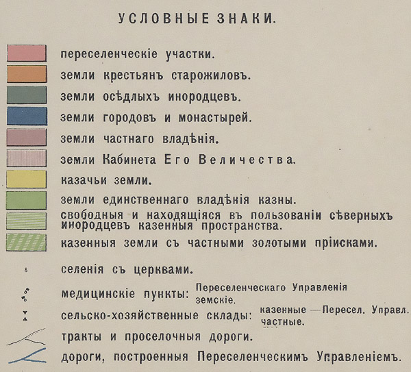 ![]() Карта из "Атласа Азиатской России издания Переселенческого управления". Атлас издан в товариществе А.Ф. Маркса под руководством Г.В. Глинки. Общая редакция карт М.А. Цветкова. Масштаб 1:3360000.Условные обозначения