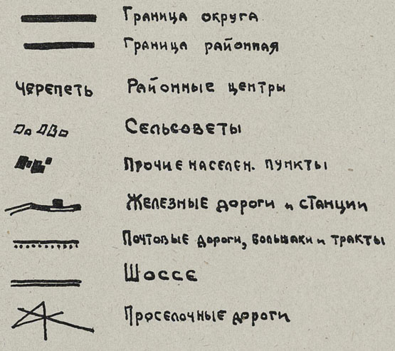 Показаны: границы округа, границы районов, районные центры, сельсоветы, прочие населённые пункты, железные дороги и станции, почтовые дороги, большаки и тракты, шоссе, просёлочные дороги. Условные обозначения