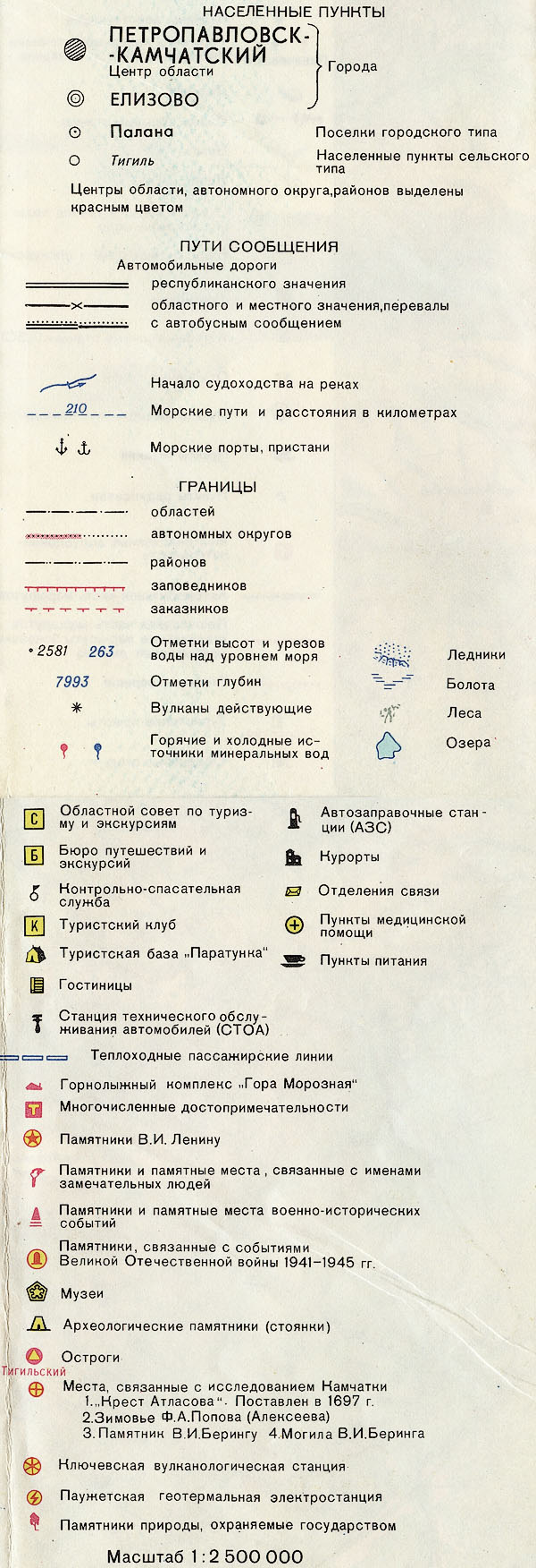 ![]() Камчатская область. Туристская карта, ГУГК 1986 год. Карта составлена и подготовлена к печати фабрикой №3. Редактор В.Д. Топчилова. Формат бумаги 72x89 см. Тираж 107900 экз. Масштаб в 1 см. 2.5 км.Оборотная сторона плана Условные обозначения