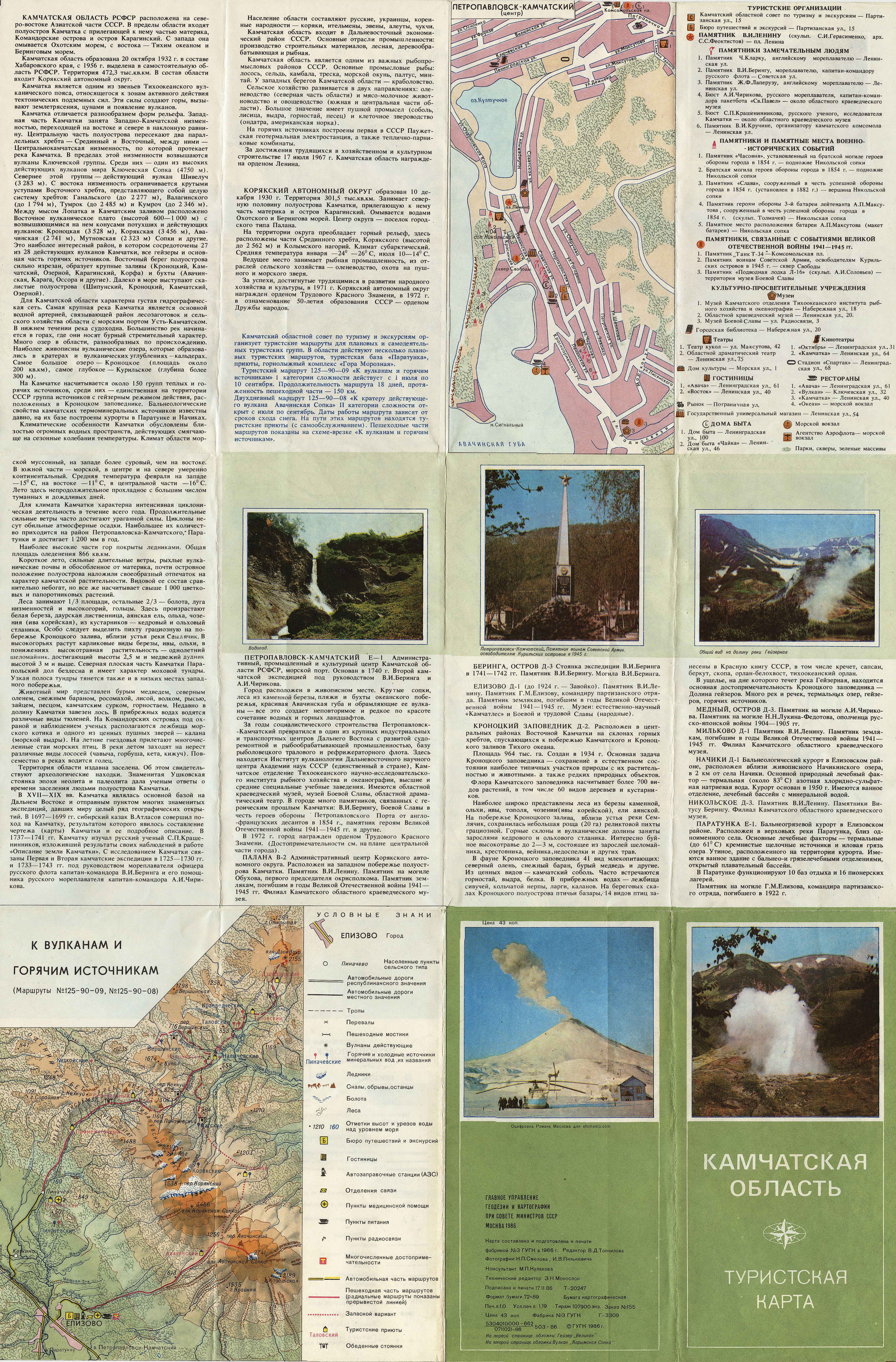 Камчатская область. Туристская карта, ГУГК 1986 год. Карта составлена и подготовлена к печати фабрикой №3. Редактор В.Д. Топчилова. Формат бумаги 72x89 см. Тираж 107900 экз. Масштаб в 1 см. 2.5 км.