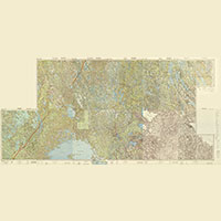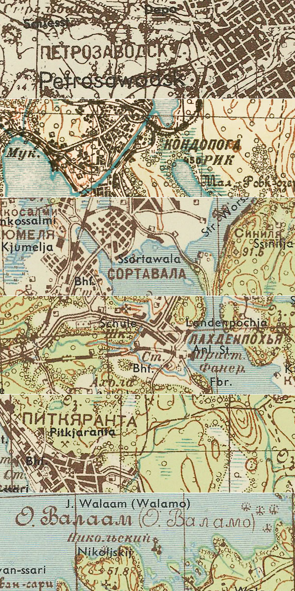 Листы военной немецкой карты Rusland масштаба в 1 см. 1 км., созданной на основе финских карт и карт РККА 1:100000 квадратов: P-36-49, P-36-50, P-36-51, P-36-52, P-36-53, P-36-54, P-36-55, P-36-56, P-36-57, P-36-58, P-36-61, P-36-62, P-36-63, P-36-64, P-36-65, P-36-66, P-36-67, P-36-68, P-36-69, P-35-83, P-35-84, P-36-73, P-36-74, P-36-75, P-36-76, P-36-77, P-36-78, P-36-79, P-36-80, P-36-81, P-35-95, P-35-96, P-36-85, P-36-86, P-36-87, P-36-88, P-36-89, P-36-90, P-36-91, P-36-92, P-36-93, P-36-94 издания 1941 года. Привязка скорректирована по местности. Показана территория около таких городов и населённых пунктов, как: Петрозаводск, Кондопога, Суоярви, Сортавала, Лахденпохья, Питкяранта, Салми, Вяртсиля, Пряжа, Эссойла, Деревянка, остров Валаам и т.д.