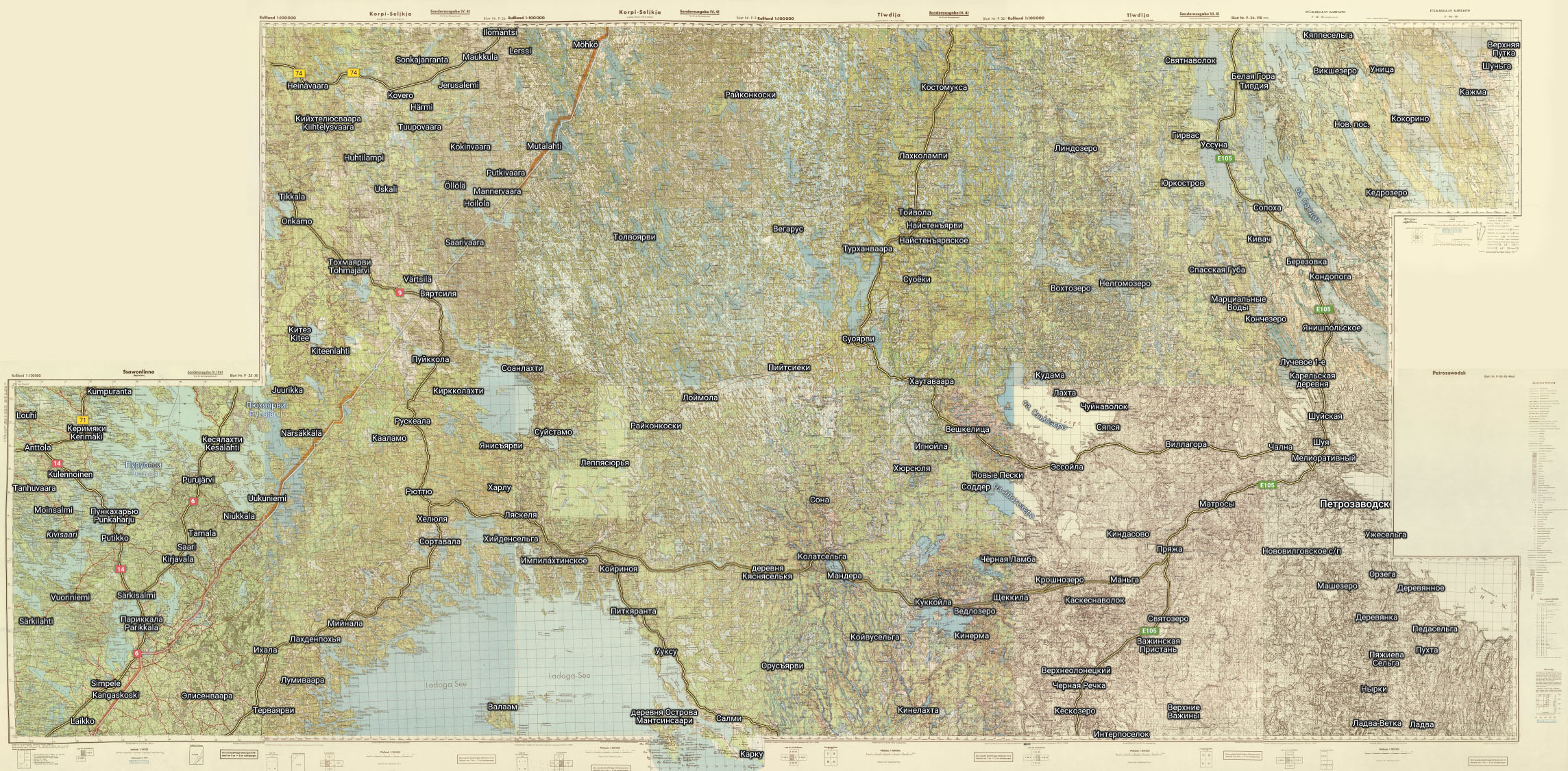 Листы военной немецкой карты Rusland масштаба в 1 см. 1 км., созданной на основе финских карт и карт РККА 1:100000 квадратов: P-36-49, P-36-50, P-36-51, P-36-52, P-36-53, P-36-54, P-36-55, P-36-56, P-36-57, P-36-58, P-36-61, P-36-62, P-36-63, P-36-64, P-36-65, P-36-66, P-36-67, P-36-68, P-36-69, P-35-83, P-35-84, P-36-73, P-36-74, P-36-75, P-36-76, P-36-77, P-36-78, P-36-79, P-36-80, P-36-81, P-35-95, P-35-96, P-36-85, P-36-86, P-36-87, P-36-88, P-36-89, P-36-90, P-36-91, P-36-92, P-36-93, P-36-94 издания 1941 года. Привязка скорректирована по местности. Показана территория около таких городов и населённых пунктов, как: Петрозаводск, Кондопога, Суоярви, Сортавала, Лахденпохья, Питкяранта, Салми, Вяртсиля, Пряжа, Эссойла, Деревянка, остров Валаам и т.д.