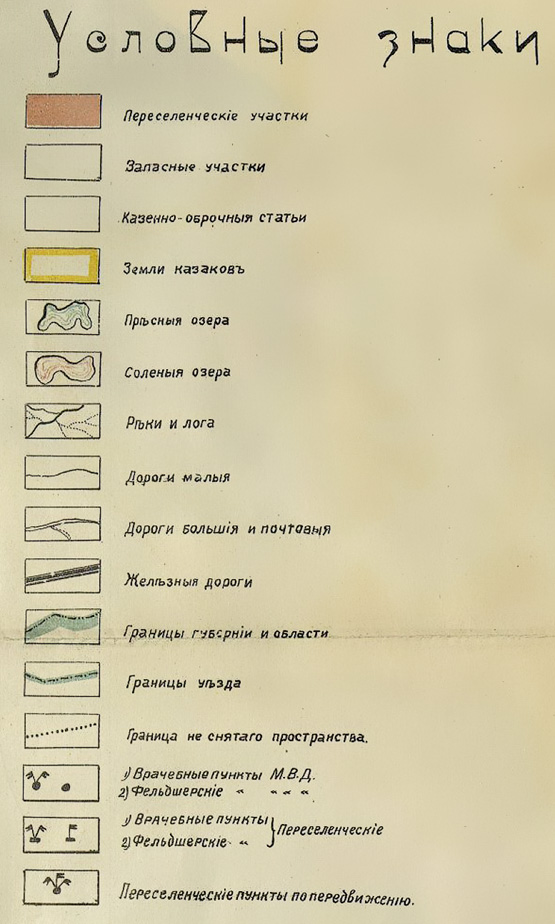 ![]() Издание Акмолинского переселенческого района. Из книги: "Справочные сведения о переселенческих селениях и участках Акмолинского переселенческого района". Сибирская электро-печатня и хромо-литография Н.А. Иванова. Чертил Т. Степанов. Масштаб 20 верст в дюйме.Условные обозначения