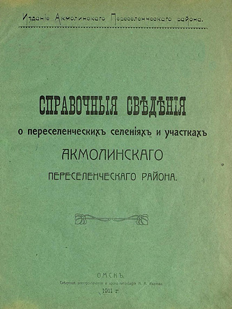 Издание Акмолинского переселенческого района. Из книги: "Справочные сведения о переселенческих селениях и участках Акмолинского переселенческого района". Сибирская электро-печатня и хромо-литография Н.А. Иванова. Чертил Т. Степанов. Масштаб 20 верст в дюйме.