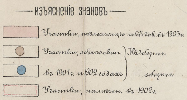 Карта Кустанайского уезда Тургайской области, с показанием естественно-исторических районов, общинно-аульных групп киргизского землепользования и образованных переселенческих участков. Масштаб 15 верст в дюйме. Чертил топограф Морозов.