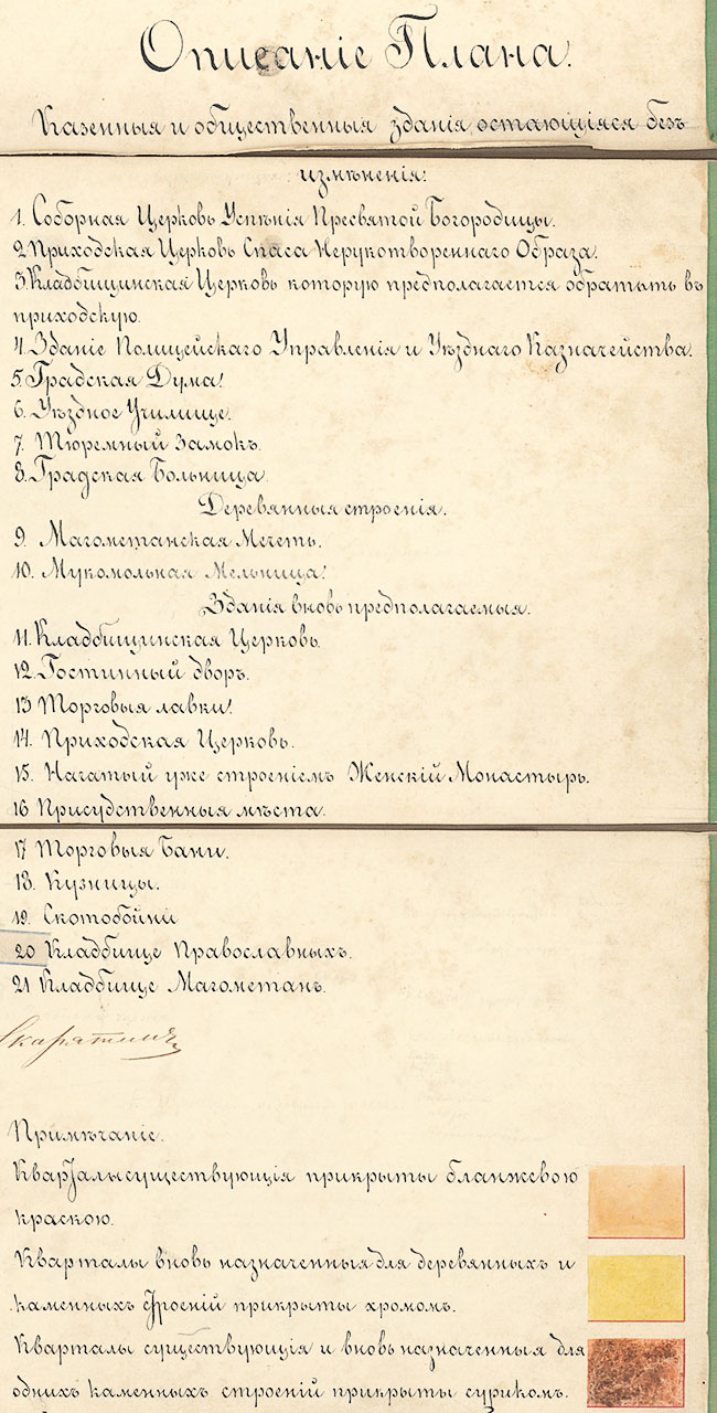 Масштаб 50 саженей в дюйме. Датировка приблизительная: на плане показан Скарятинский сад, который был возведён в мае 1868 г., но ещё не показан Успенский храм, освящённый в 1879 г.