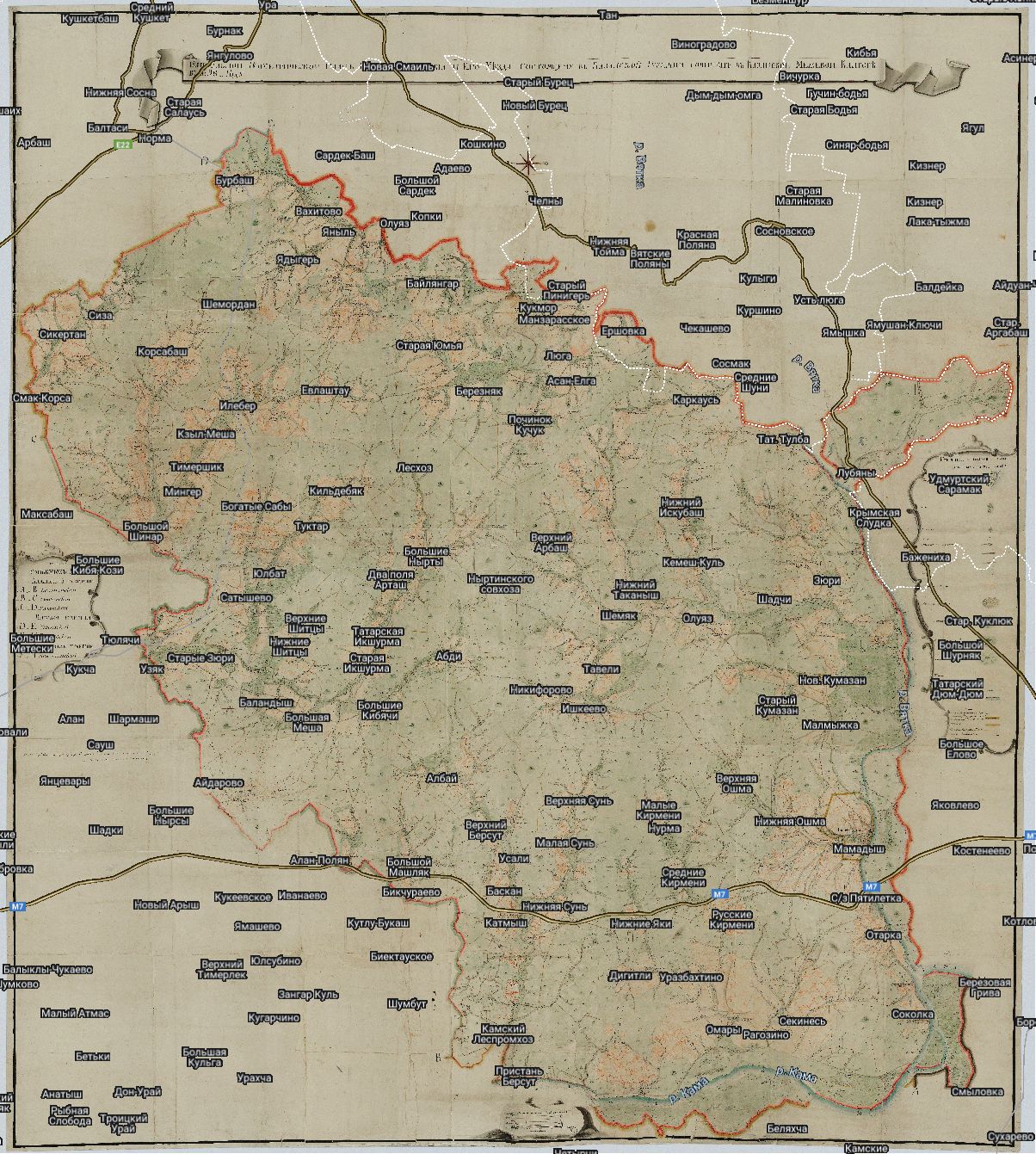 План Генерального Межевания Мамадышского уезда. Полное название: "Генеральный геометрический план города Мамадыша и его уезда, состоящего в Казанской губернии. Сочинен в Казанской межевой конторе в 1798 году". Масштаб 500 саженей в дюйме, верстовка. По данным межевания с 1793 года.