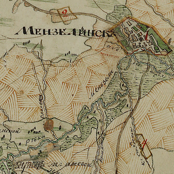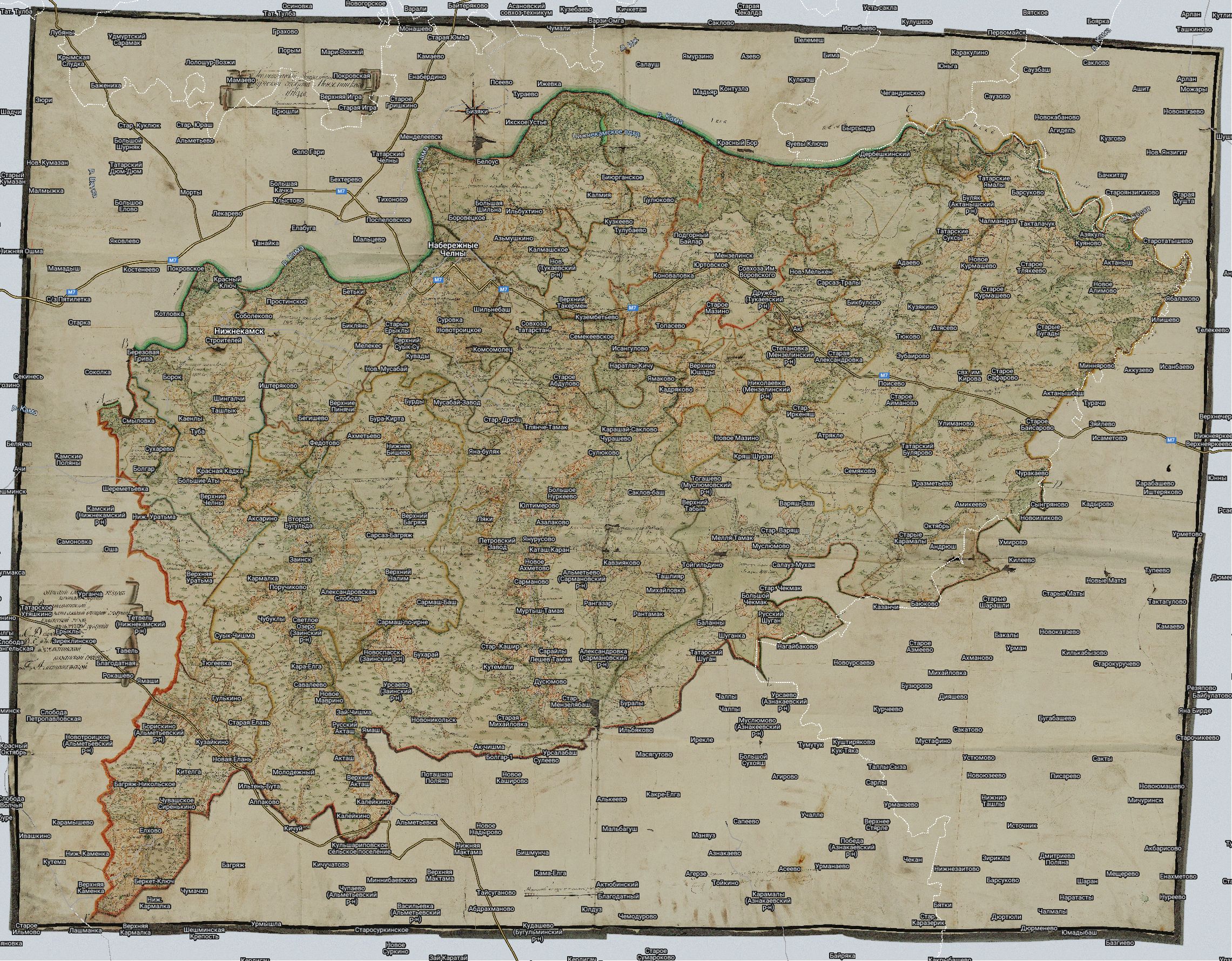 План Генерального Межевания Мензелинского уезда. Полное название: "Геометрический генеральный план Оренбургской губернии Мензелинского уезда". Масштаб в английском дюйме 2 версты. По данным межевания с 1798 года.
