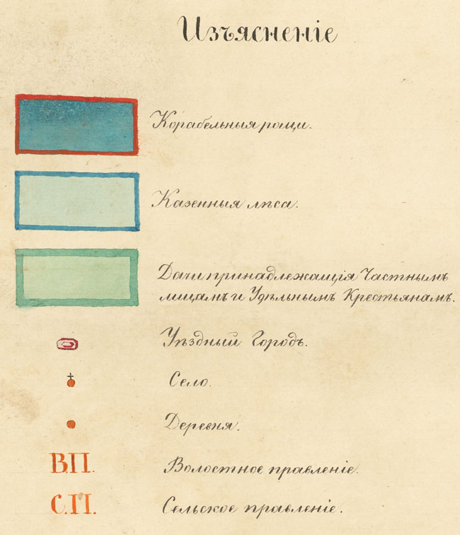 Масштаб в английском дюйме 4 версты. Показаны: корабельные рощи, казенные леса, дачи принадлежащие частным лицам и уездным крестьянам. Датировка приблизительная.