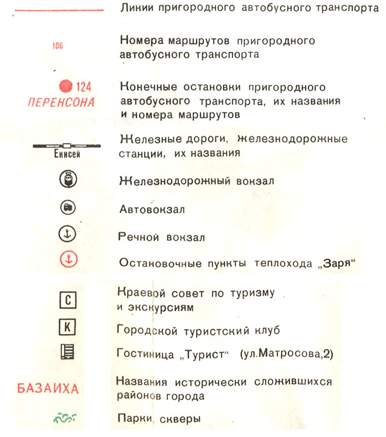 На карте показаны: линии пригородного автобусного транспорта, номера маршрутов, конечные остановки, железные дороги и станции, железнодорожный вокзал, автовокзал, речной вокзал, остановочные пункты теплохода Заря, краевой совет по туризму и экскурсиям, названия исторически сложившихся районов города, парки и скверы.