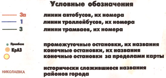 Карта-схема подготовлена издательским домом "Сибирия". Показаны линии и номера автобусов, троллейбусов, трамваев, а также исторически сложившиеся названия районов города.