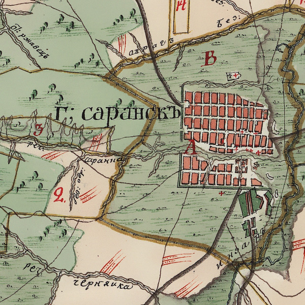План генерального межевания Саранского уезда. Масштаб межевой карты 1:84000, двухверстовка. По данным межевания с 1798 года. На момент издания карты находился в Симбирской губернии.
