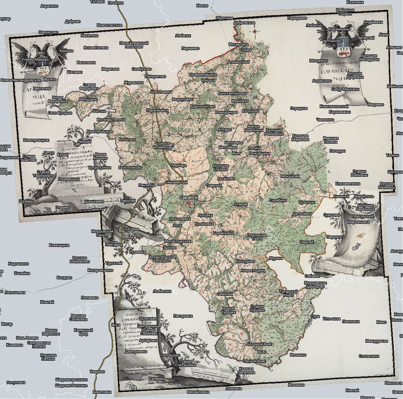 План генерального межевания Саранского уезда. Масштаб межевой карты 1:84000, двухверстовка. По данным межевания с 1798 года. На момент издания карты находился в Симбирской губернии.