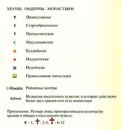 На карте показано местонахождение на территории Московской области православных монастырей и храмов различных конфессий - православных, протестантских, старообрядческих, мусульманских, иудейских, буддийских, индуистских, а также количество храмов и религиозных общин в том или ином населенном пункте.