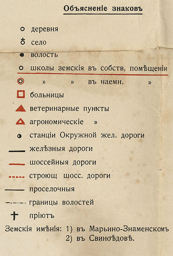 Карта с нанесением окружной дороги, земских школ, больниц, ветеринарных и агрономических пунктов. Издание Московского Уездного Земства. Размер 70x44 см. Масштаб в 1 дюйме - 4.3 версты.