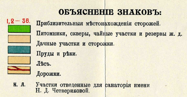 Показано: приблизительное местонахождение сторожей, питомники, скверы, чайные участки и резервы ж.д., дачные участки и сторожки, пруды и реки, леса, дорожки, участки отведенные для санатория имени Н.Д. Четвериковой. Условные обозначения