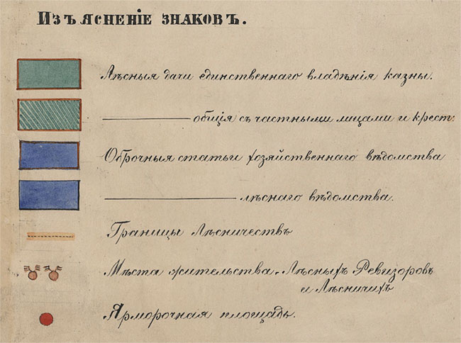 Показаны: лесные дачи единственного владения казны и общие с частными лицами и крестьянами, оброчные статьи хозяйственного и лесного ведомств, границы лесничеств, места жительства лесных ревизоров и лесничих, ярмарочные площади. Условные обозначения