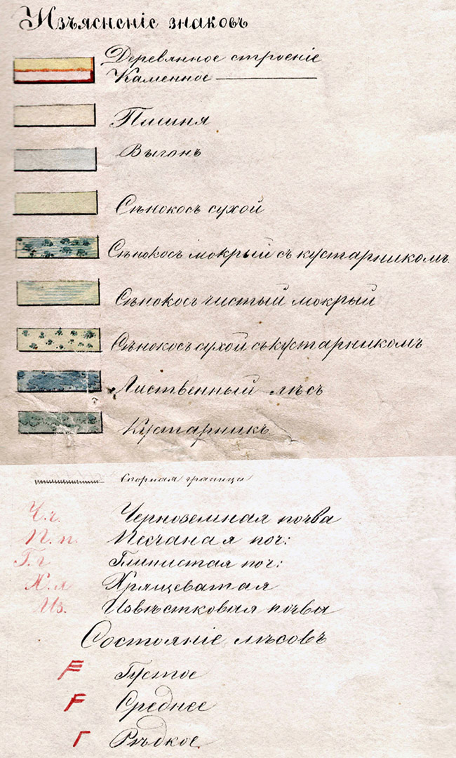 План Оренбурга Оренбургской губернии и выгонной земли 1-й пропорции, с показанием нарезанных в ней участков пахотных, сенокосных и лесных. Съемка произведена в 1848 и 1849 годах. Масштаб в английском дюйме 250 сажень.