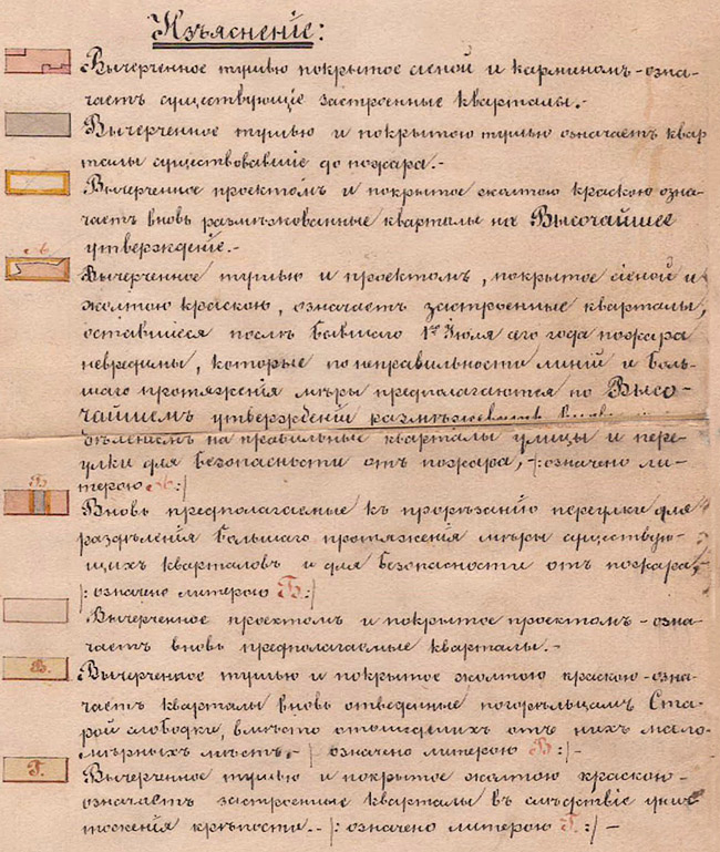 Генеральный план с показанием прежде существовавших в Старой Слободке кварталов до пожара бывшего 1 июля сего года и вновь размежеванных, а также предполагаемых к застройке кварталов, на высочайшее утверждение. Создан в декабре 1864 года. Масштаб в английском дюйме 50 сажень.