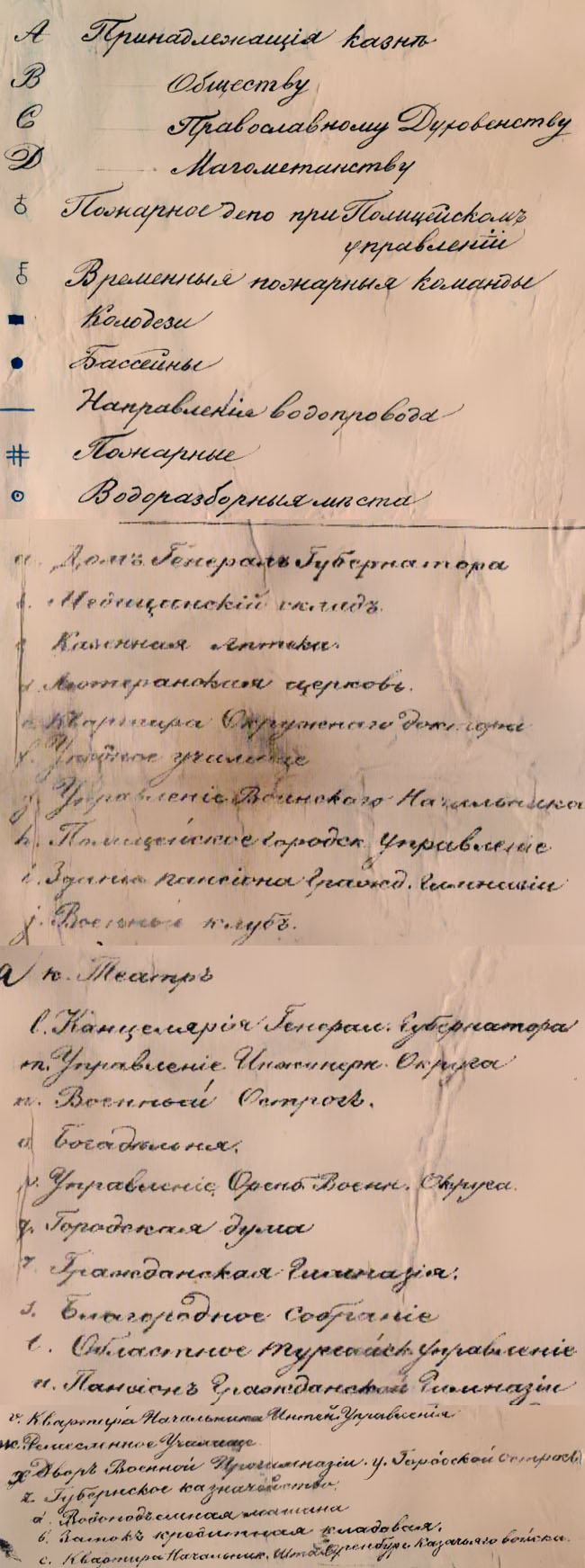 Масштаб 50 саженей в дюйме. Показан водопровод и пожарная инфраструктура города: пожарное депо при полицейском управлении, временные пожарные команды, колодцы, бассейны, указано направление водопровода и водозаборные места.