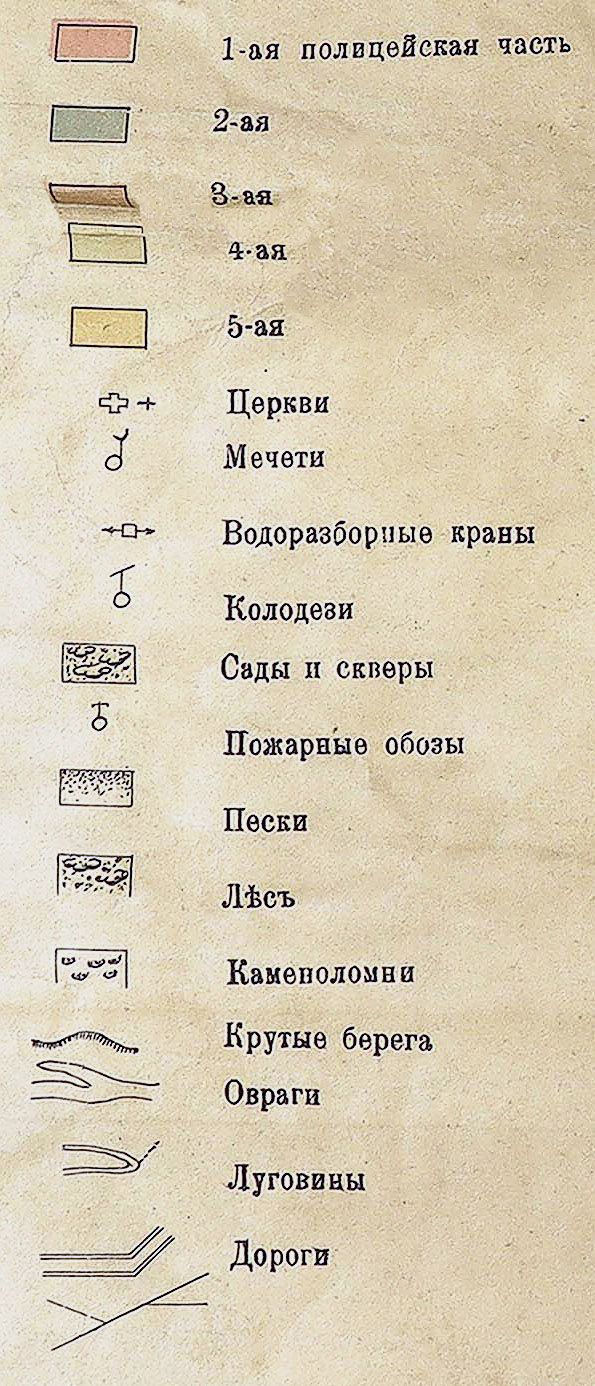 Показаны: полицейские части, церкви, мечети, водозаборные краны, колодези, сады и скверы, пожарные обозы, пески и леса, каменоломни, крутые берега, овраги, луговины и различные дороги. Условные обозначения