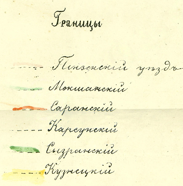 Литография Пензенского губернского правления. Чертил А. Соколов. Масштаб 5 верст в дюйме. Показаны: границы уезда, город, села, деревни, главные и прочие просёлочные дороги.