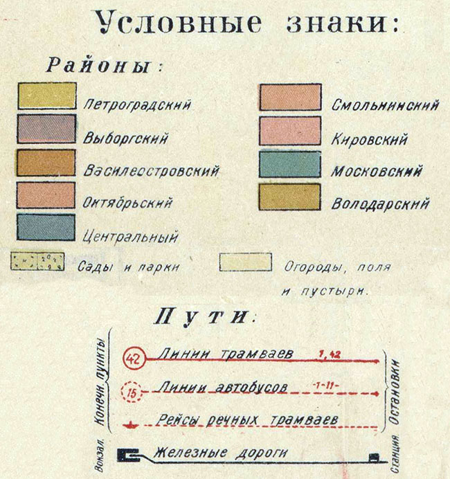 Издательство Ленинградского облисполкома и Ленинградского совета. Составитель И.Ф. Филиппов. Ответственный редактор А.Г. Русс. Масштаб 1:25000. 1-я типография. Тираж 5000. Показаны линии трамваев, маршруты автобусов, рейсы речных сообщений, железные дороги.