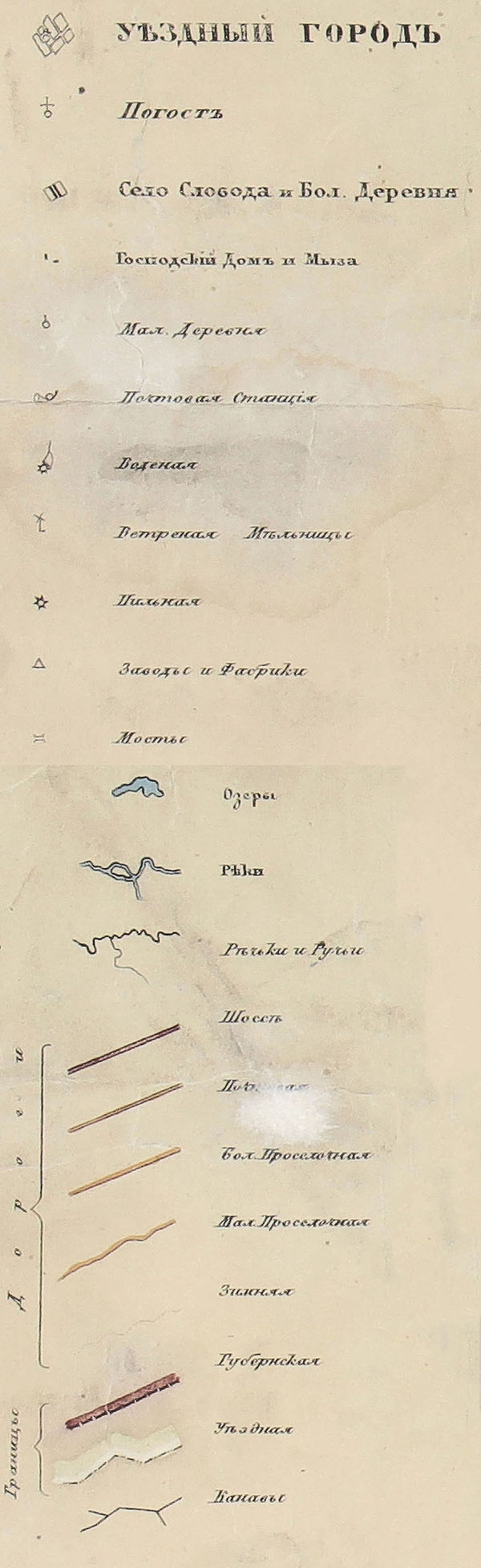 Показаны: уездный город, погосты, сёла, слободы, большие деревни, господские дома и мызы, малые деревни, почтовые станции, водяные и ветряные мельницы, пильные, заводы и фабрики, мосты, различные дороги и элементы рельефа, включая канавы. Фрагмент карты