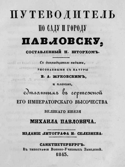 План города сделан в чертёжной его императорского высочества, великого князя Михаила Павловича. Отпечатано в литографии Селезнёва. Масштаб 100 саженей в дюйме. Из книги: "Путеводитель по саду и городу Павловску, составленный П. Шторхом".