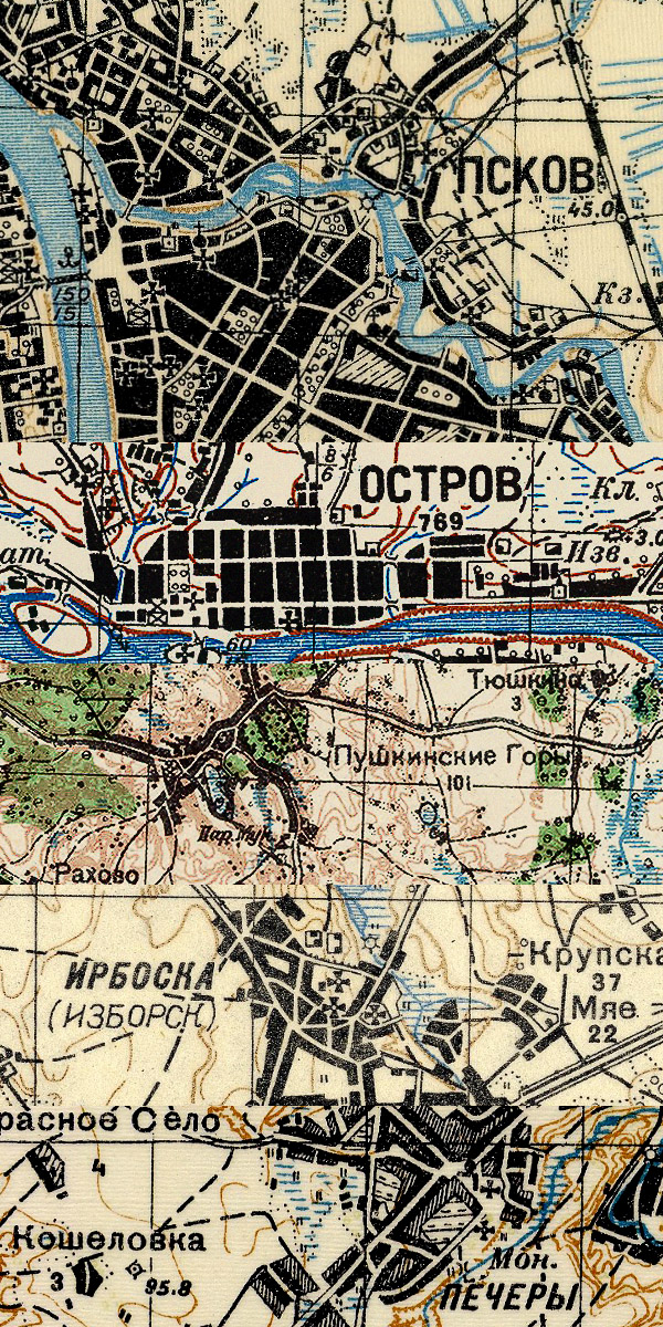 Сборная карта из 42 листов полукилометровок РККА и аналогичных по масштабу немецких карт, созданных на основе карт РККА: O-35-79-(БГ), O-35-80-(АБВГ), O-35-81-(АБВГ), O-35-82-(АБВГ), O-35-91-(БГ), O-35-92-(АБВГ), O-35-93-(АБВГ), O-35-94-(АБВГ), O-35-103-(БГ), O-35-104-(АБВГ), O-35-105-(АБВГ), O-35-106-(АБВГ). На карте показана территория вокруг таких городов и населённых пунктов, как: Псков, Остров, Печоры, Пыталово, Пушкинские Горы, Изборск, Виляка, Балви, Кебь, Палкино, Торошино, Качаново и т.д.