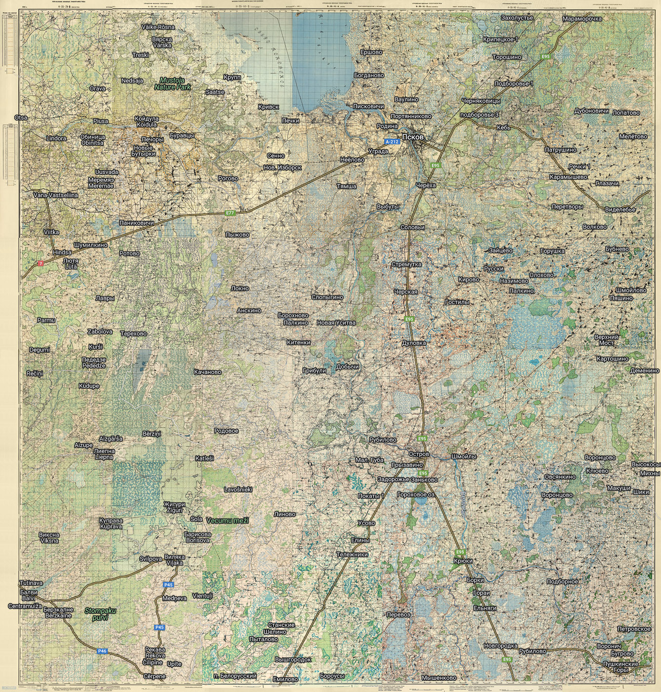 Сборная карта из 42 листов полукилометровок РККА и аналогичных по масштабу немецких карт, созданных на основе карт РККА: O-35-79-(БГ), O-35-80-(АБВГ), O-35-81-(АБВГ), O-35-82-(АБВГ), O-35-91-(БГ), O-35-92-(АБВГ), O-35-93-(АБВГ), O-35-94-(АБВГ), O-35-103-(БГ), O-35-104-(АБВГ), O-35-105-(АБВГ), O-35-106-(АБВГ). На карте показана территория вокруг таких городов и населённых пунктов, как: Псков, Остров, Печоры, Пыталово, Пушкинские Горы, Изборск, Виляка, Балви, Кебь, Палкино, Торошино, Качаново и т.д.