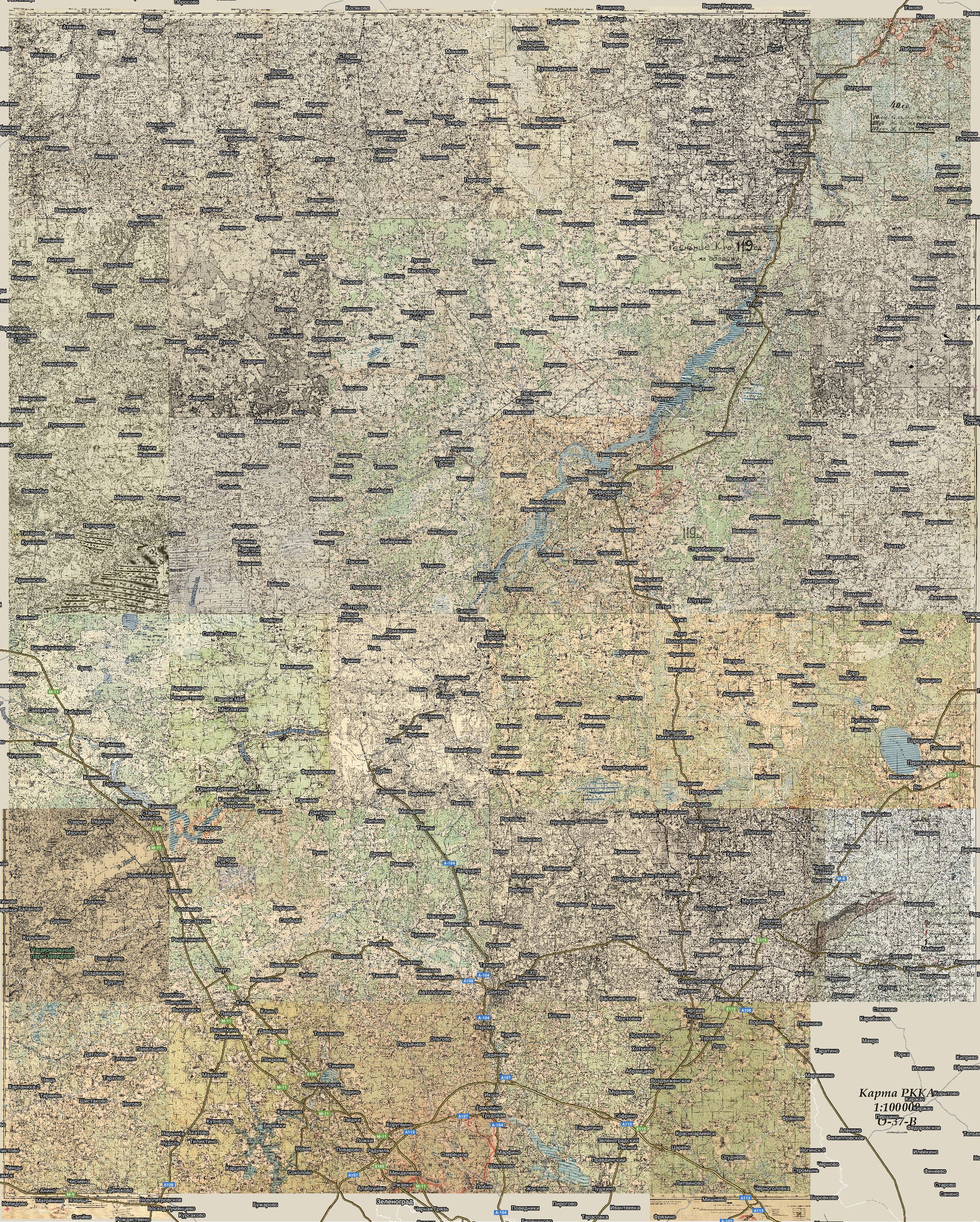 Сборная карта квадрата O-37 (часть В) из отдельных листов топографической военной карты Рабоче-Крестьянской Красной Армии (РККА) масштаба 1:100000, в 1 см. 1 км. Состояние местности на 1934 - 1940 предвоенные годы.
